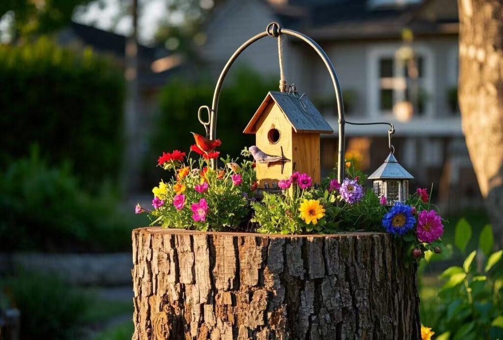 Tree stumps can also be used as simple yet striking focal points in your garden. Whether it’s a small stump or a large one, you can decorate it by stacking colorful planters or placing a beautiful sculpture or birdbath on top. Adding tall plants around the stump can make it stand out and draw attention to the natural beauty of the wood. This idea works especially well if you have multiple stumps in your yard, creating a theme or visual interest.