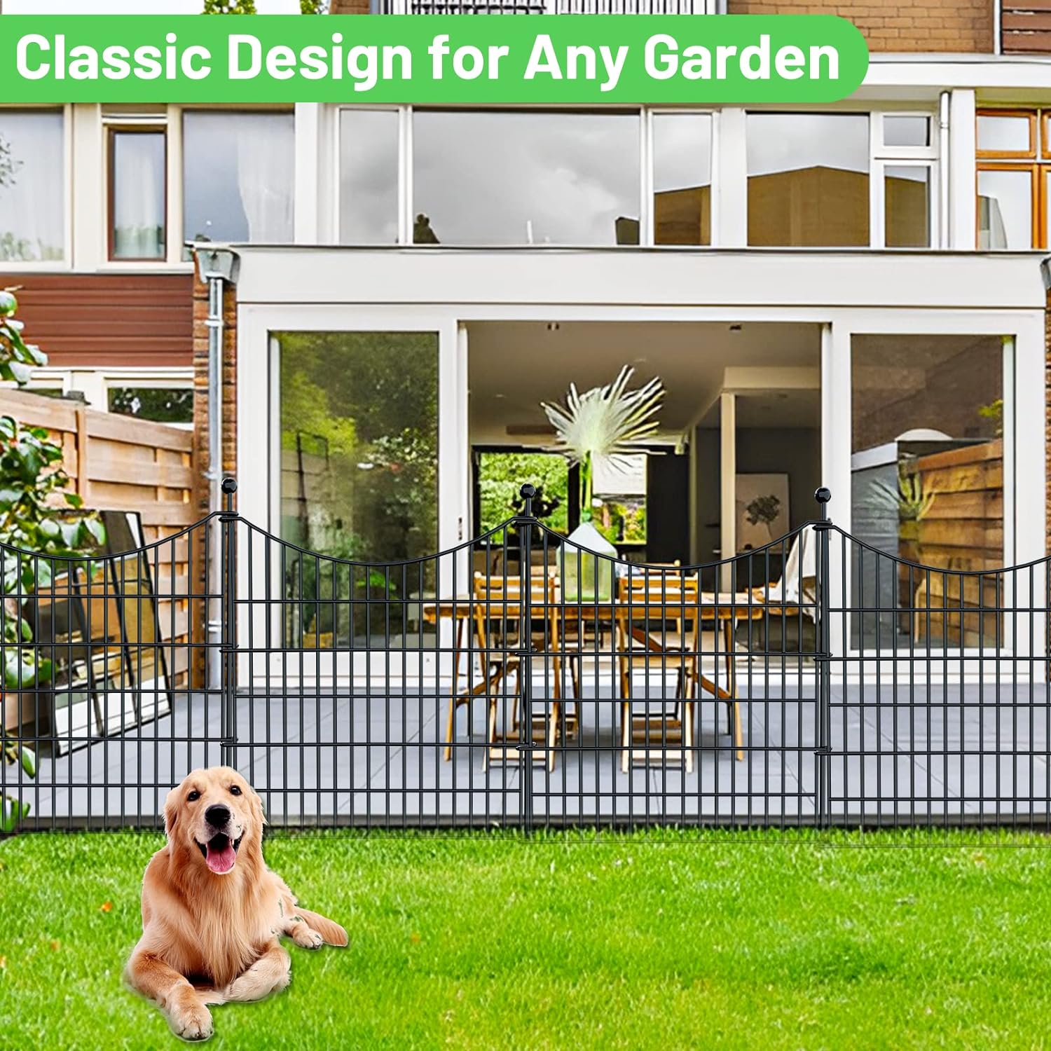 • Diseño clásico para cualquier jardín: la valla de metal para jardín cuenta con un diseño clásico que complementará cualquier estilo de jardín. El acabado de metal negro es elegante y moderno, mientras que los piquetes de lanza añaden un toque de elegancia. Esta valla es perfecta para definir bordes de jardín, crear un área de juego segura o mantener a las mascotas contenidas.