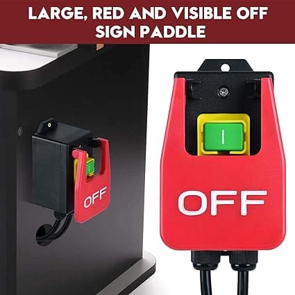 - EASY TO LOCATE: Large paddle for emergency stop. Engaged with a large green recessed ON button safeguarding against accidental starts, and a large red, easy to see OFF paddle. No more feeling around underneath your table to find your switch. The large sign paddle uses high-hardness materials and is more durable.