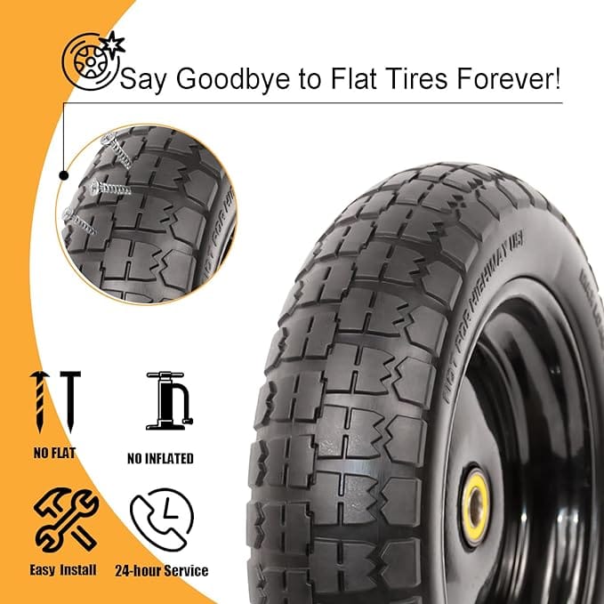 - ✅【High Quality】The Wheelbarrow Tires wheel are made of solid polyurethane tire and steel hub,highly durable materials,the solid and durable construction ensures that the flat free wheelbarrow tire are wear, puncture, tear, and rot-resistant and have a longer service life.