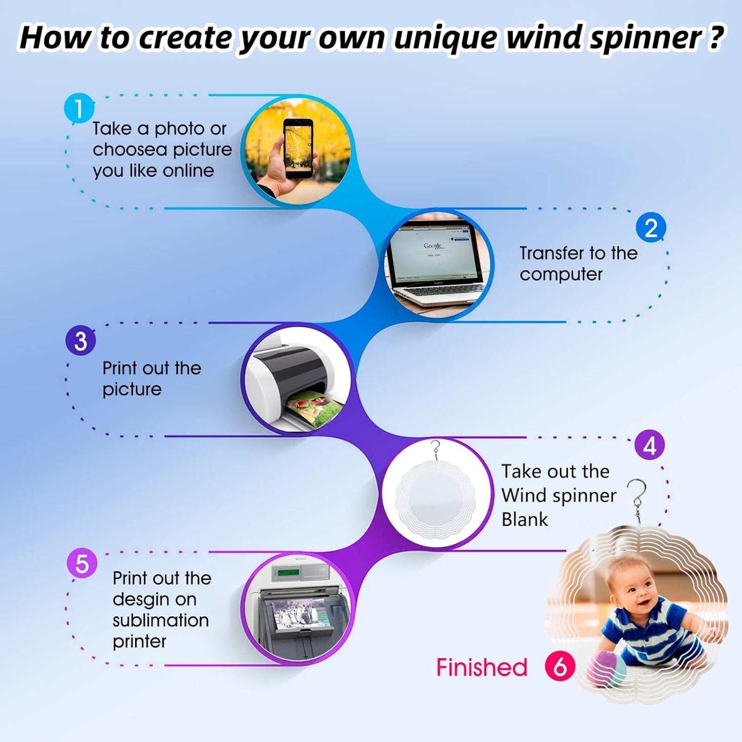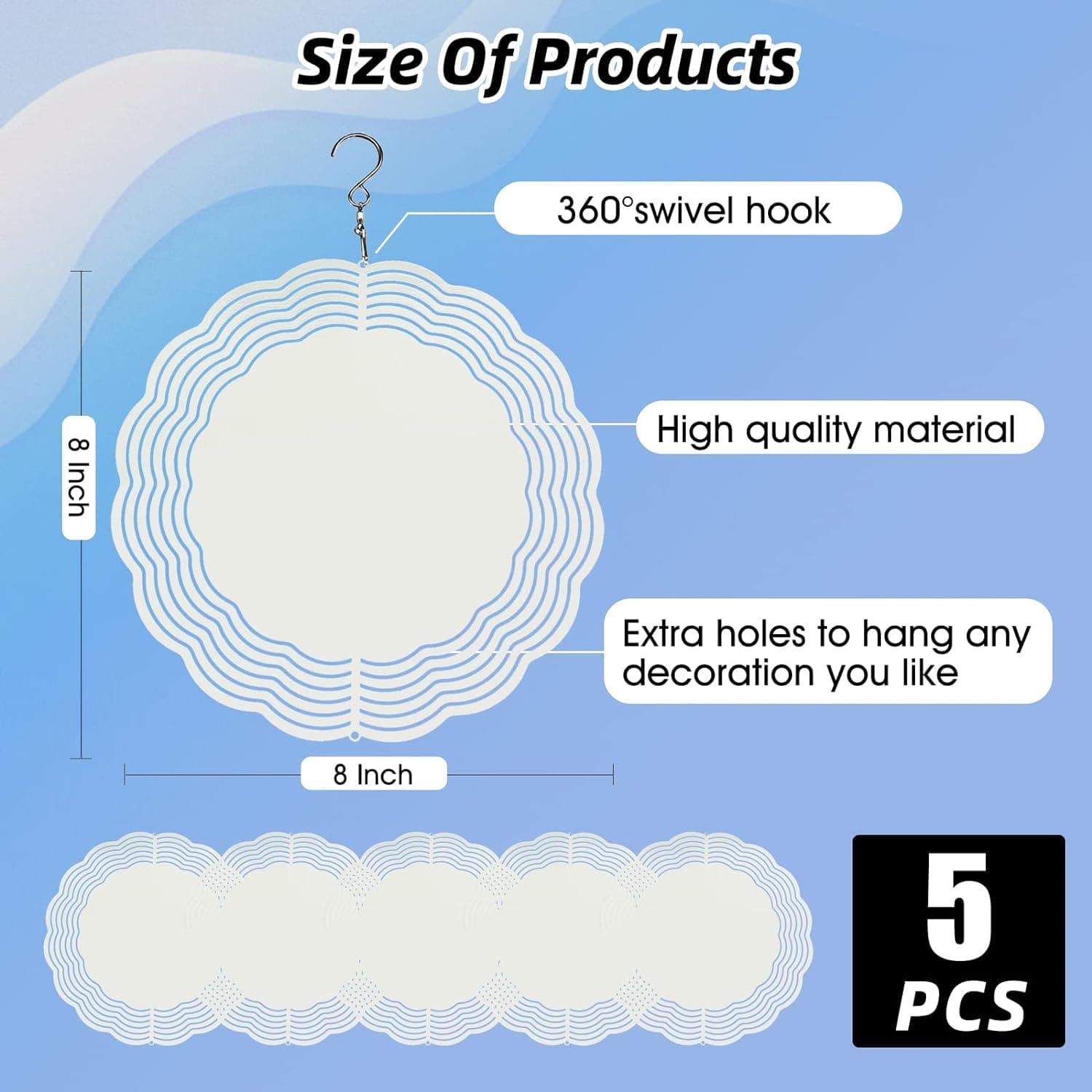 • 【Package Contents】You will get 5 pack of Sublimation Wind Spinner blanks and 5 hooks. The size of each Wind Spinner Blank is about 8 inches. These Wind Spinners can be used for double-sided sublimation and DIY your favorite patterns.