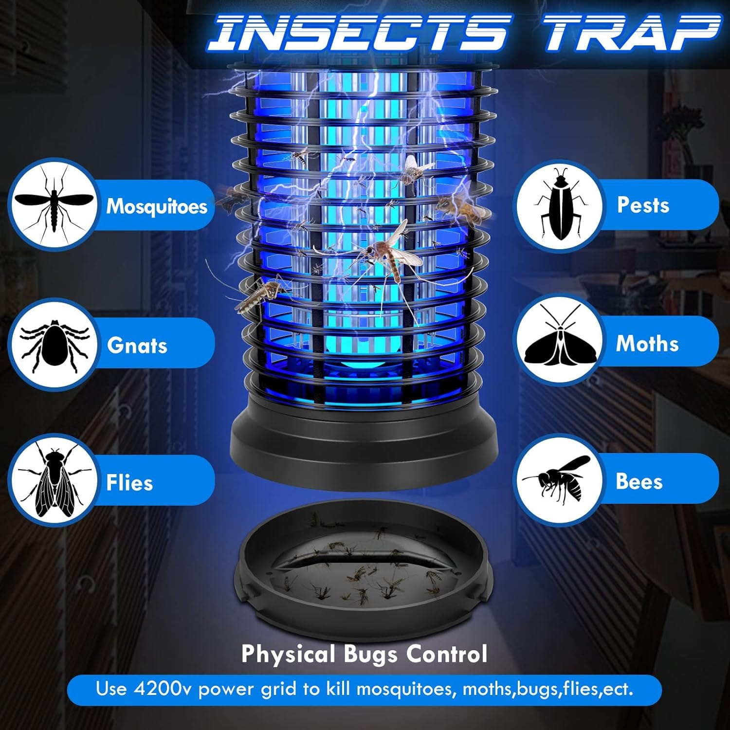 - Bug zapper come with 15W bulb emits blue purple light to attract bugs, once bugs flies in, it will be immediately killed by 4200v power grid, which can effectively eliminate mosquitoes, moths, bedbugs, flies, ect.