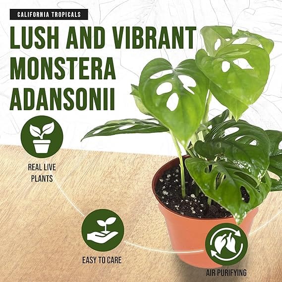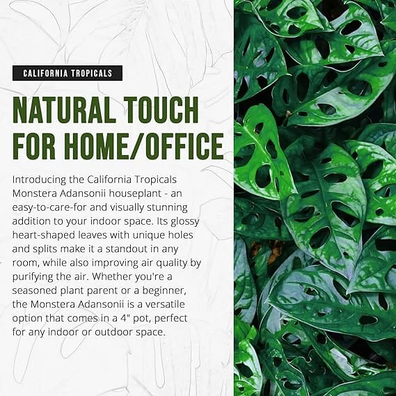California Tropicals Monstera Adansonii Real Live Indoor Houseplants – Big Low Light Tropical Plant for Air Purifying Decorations – 4″ Pots Easy Planting in Homes, Offices, and Outdoor Gardens