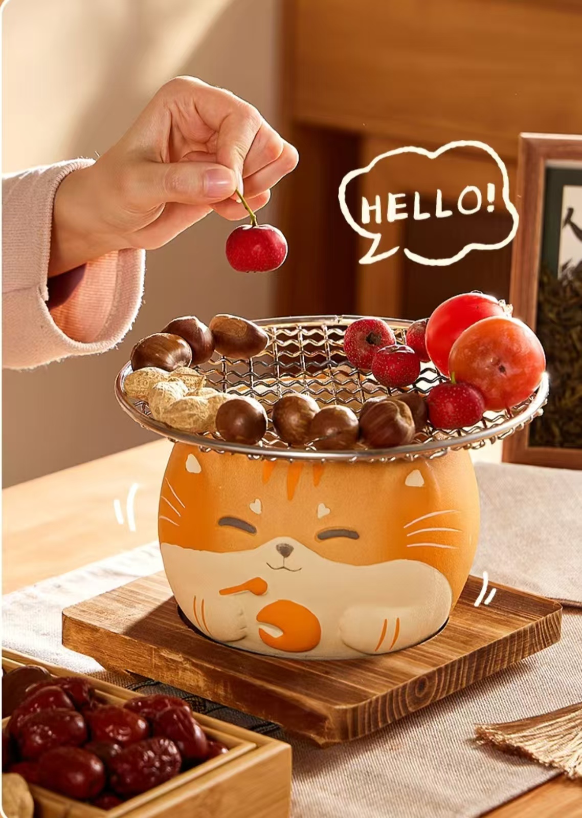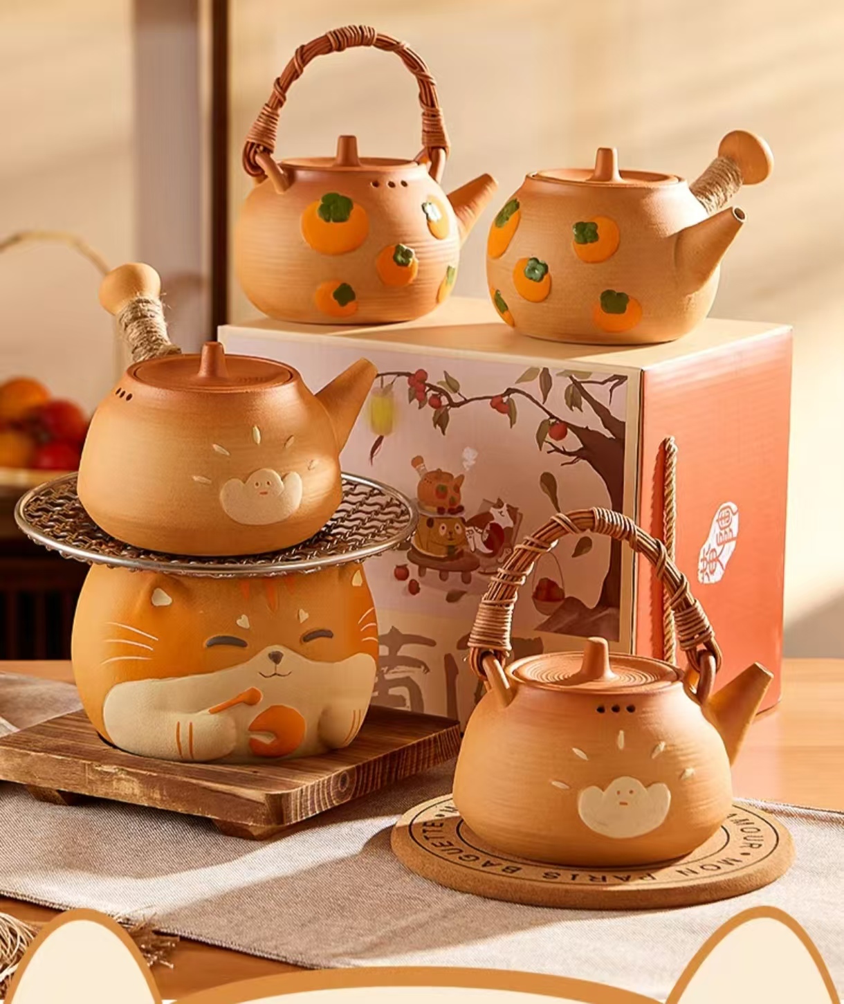 In addition to its unique appearance, the Cat-Face Ceramic Teapot also excels in practicality. A small lid is equipped on top of the teapot, convenient for maintaining the temperature of the tea when pouring. The wooden spoon inserted into the spout makes it easier for people to taste the tea. Furthermore, the teapot has a moderate capacity, suitable for either enjoying tea alone or sharing with family and friends.