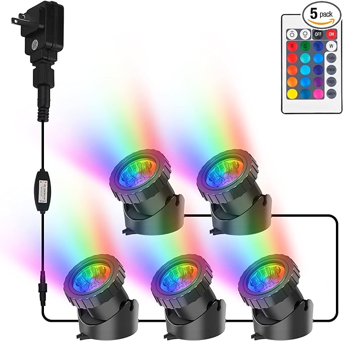 - ๐[5-in-1 Pond Lights] Adjustable, Brighter & Longer Wire. The light heads can be adjusted 90 degrees. One light have 18 LED beads, total cable length 5.5m, more flexible and convenient to use.โคFor the first time, please press the “STROBE” and “FADE” buttons at the same time to activateโค