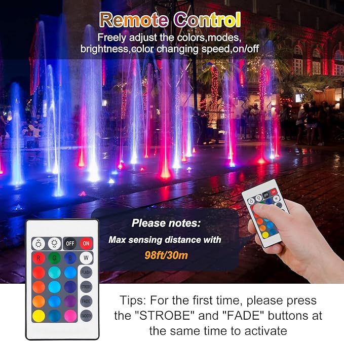- ๐[RGB Pond Light with Remote Control ] Our LED underwater spot lights provides 16 colors, 4 modes of dynamic effects, and static fixed color effects, brightness adjustable, you can freely control the lamp via the wireless remote.