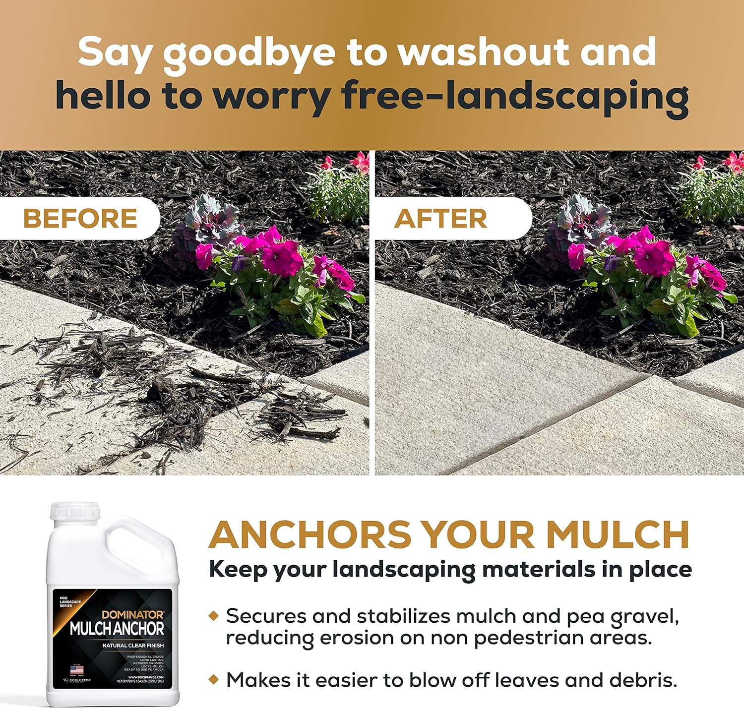 - FRUSTRATED WITH MAINTAINING MESSY LANDSCAPES? Mulch Anchor reduces erosion and acts as a mulch glue or gravel binder to reduce washout. Perfect for use in landscaping areas, where you want to make it easier to blow leaves and debris off and leave your mulch in place!
