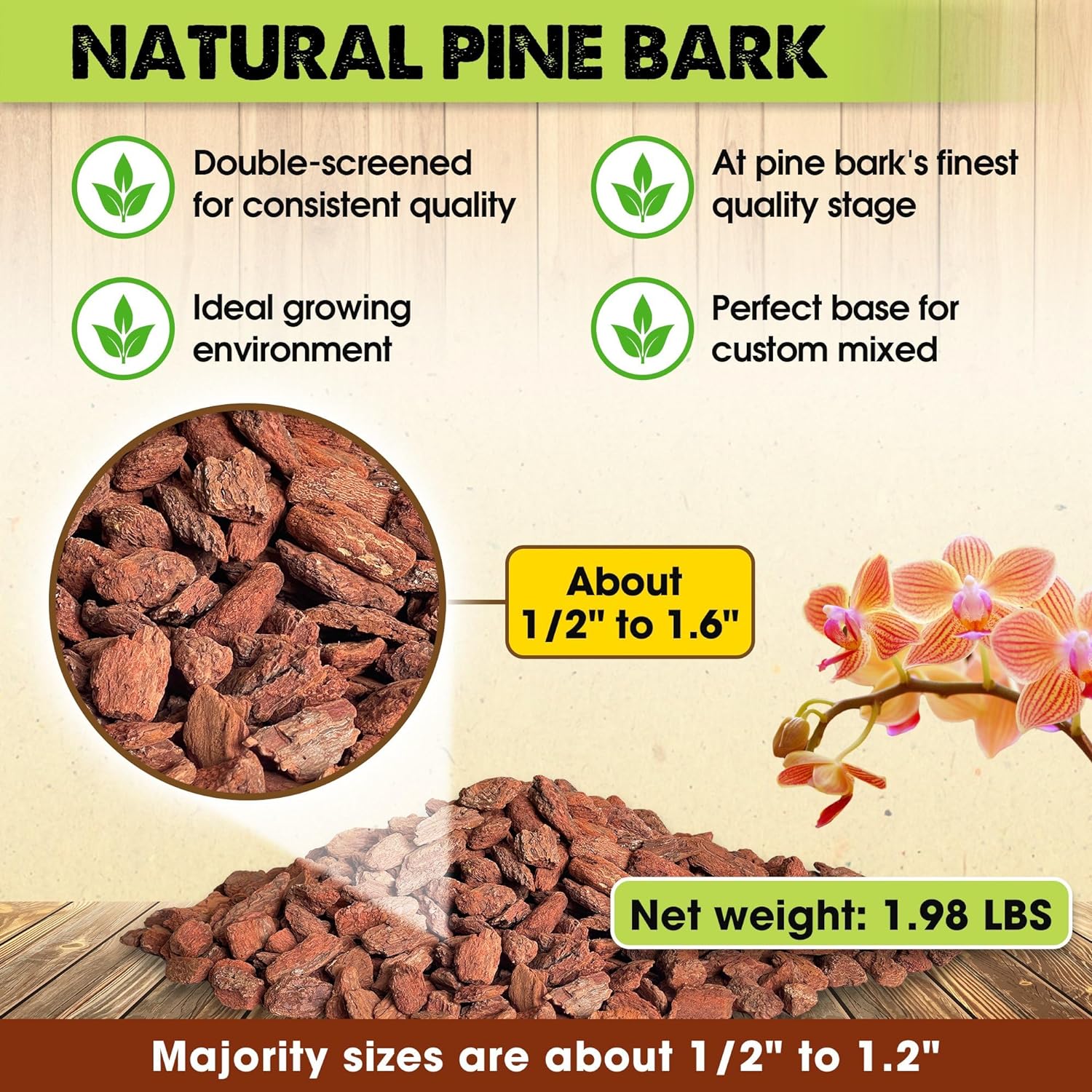 - 𝐍𝐀𝐓𝐔𝐑𝐀𝐋 𝐑𝐄𝐃 𝐏𝐈𝐍𝐄 𝐁𝐀𝐑𝐊: Our orchid bark is natural red pine bark, harvested in the short-term raw material area, ensuring the highest quality without affecting the ecosystem. Unlike other dry and hard pine barks on the market, our pine bark provides optimal porosity and moisture retention, making it an ideal orchid bark for indoor plants.