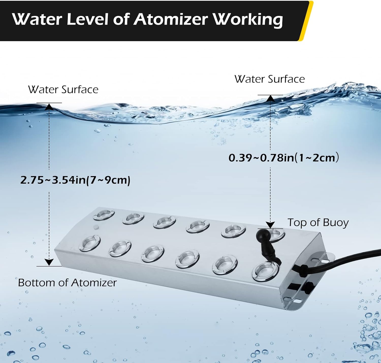 - 💦8500ml/H Ultrasonic Mist Maker- The ultrasonic mist maker for pond with waterproof power supply and buoy, 12 spray heads, the spray volume can be up to 8500ml/H, the IP67 waterproof mist humidifier can use ambient temperature: +1~45℃ and use environmental water depth: 7-9cm. We provide 10pcs additional sprayer sheets for replacement, a total of 22 (12+10) are included in the package.