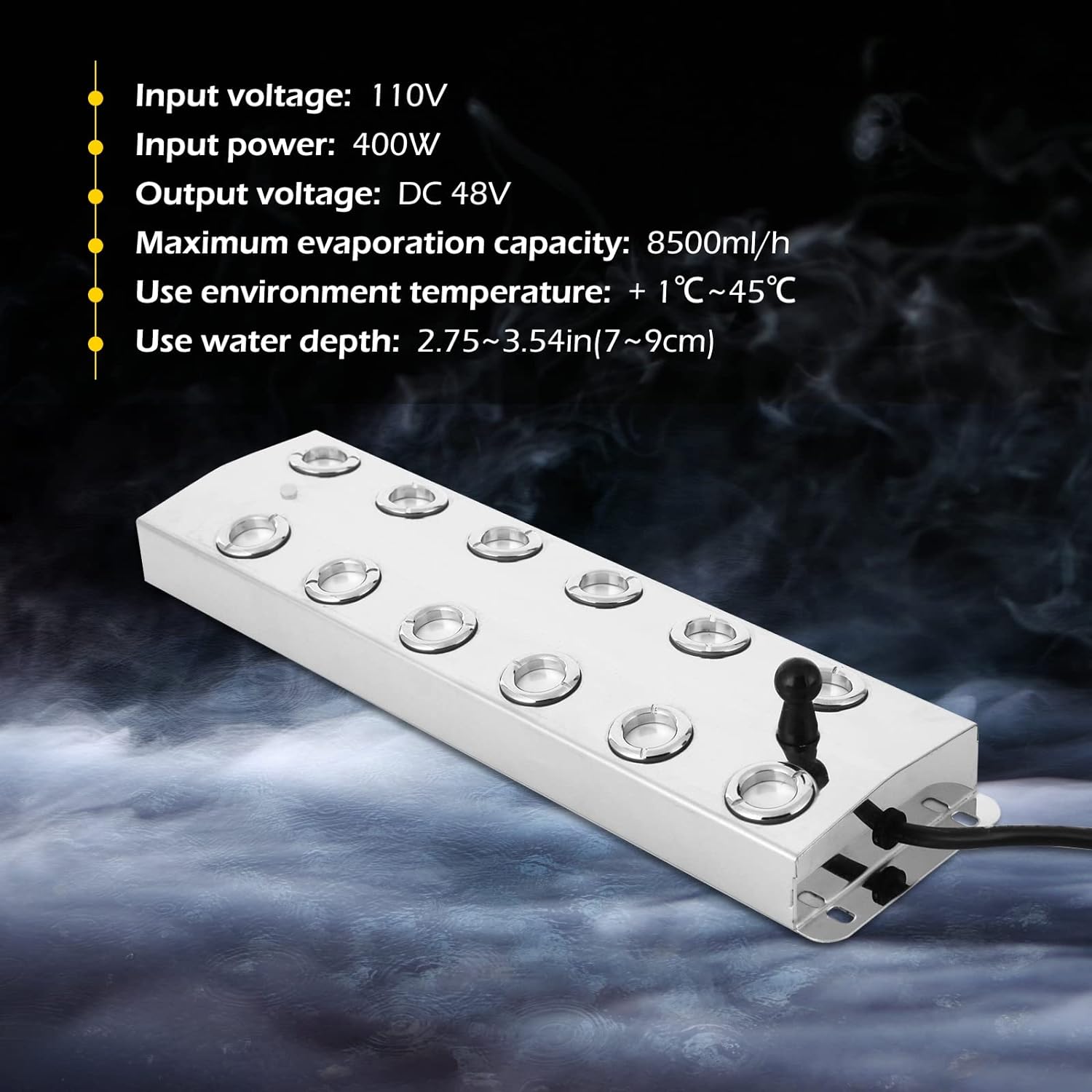 - 💦Professional IP67 Waterproof- The 12-head ultrasonic pond fogger machine adopts IP67 waterproof. The 400W 110V waterproof power supply is suitable for a dry or humid environment(not be placed directly in the water), and the ultrasonic mister maker will not be damaged due to the generation of fog, and longer service life. The transformer is moisture-proof and not waterproof.