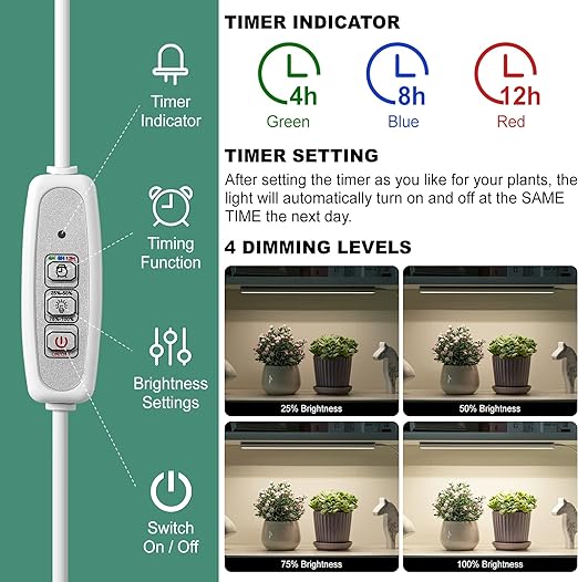- Timer Function & Auto On/Off: This LED plant lamp has a circular storage timer function and can be set to 4, 8, 12 hours as the plant needs. After setting the time, it will automatically turn on and off at the same time the next day, no need to unplug/re-plug. It will take good care of your plants while you are at work or on vacation, easy & convenient!
