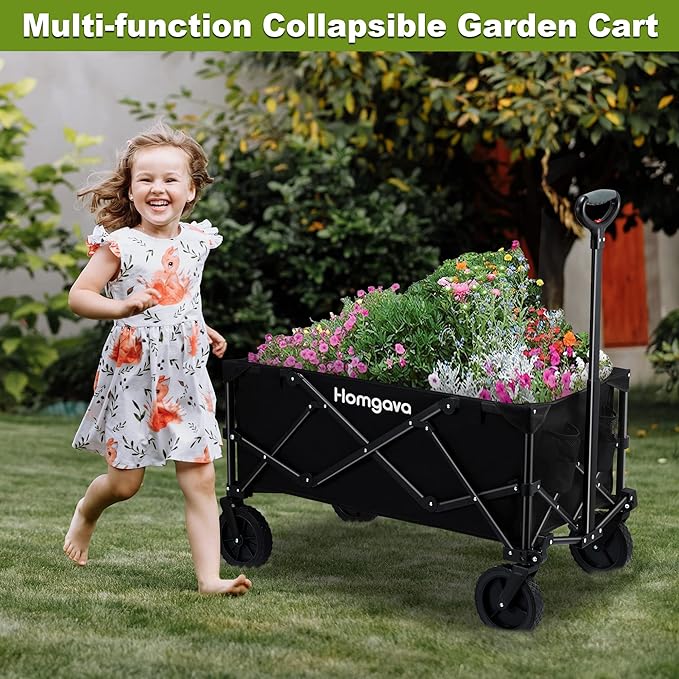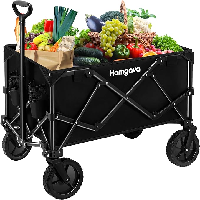 Homgava Collapsible Folding Wagon Cart,Outdoor Beach Wagon,Heavy Duty Garden Cart with All Terrain Wheels,Portable Large Capacity Utility Wagon for Camping Fishing Sports Shopping, Black