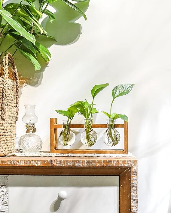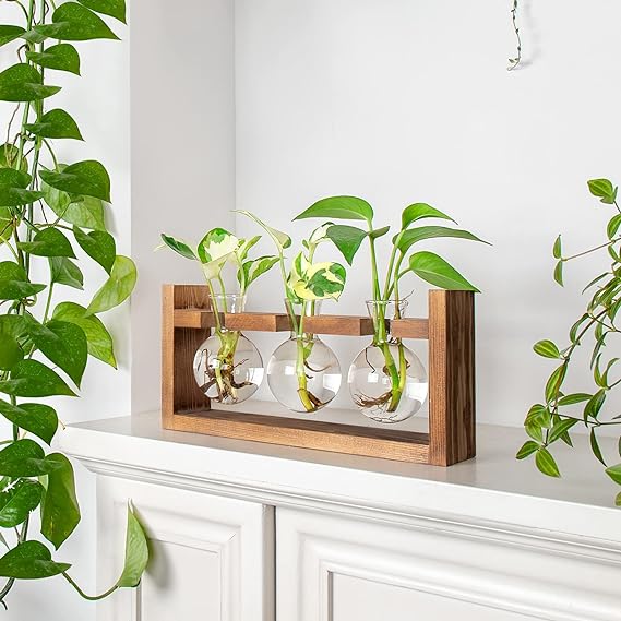 - [ Cute Propagation Station ]: Vintage designed plant terrariums with mini bulb shape bottle in wood stand. Bring some of the outdoors in with this stunning handmade propagation station.