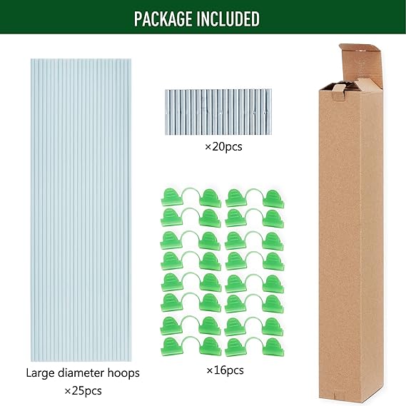 • 【DIY KIT】Comes with 25 large diameter hoops, each 17″ in length, 20 connectors, and 16 clips. You can combine 5 or more hoops to DIY your own grow tunnel. Additionally, you can use the clips to secure the greenhouse covering.