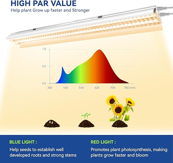 - 【High Output Plant Light】Equipped with High-quality LED chips and aluminum housing, the light efficiency is increased by 25%,which can perfectly meet the light needs of great majority plants throughout the growth cycle,such as veggies/tomato/peppers/leafy greens /herbs /succulents /orchids,etc. What’s more,the light can also be installed at the bottom of wooden cabinet, and no need to worry about safety issues due to heat.