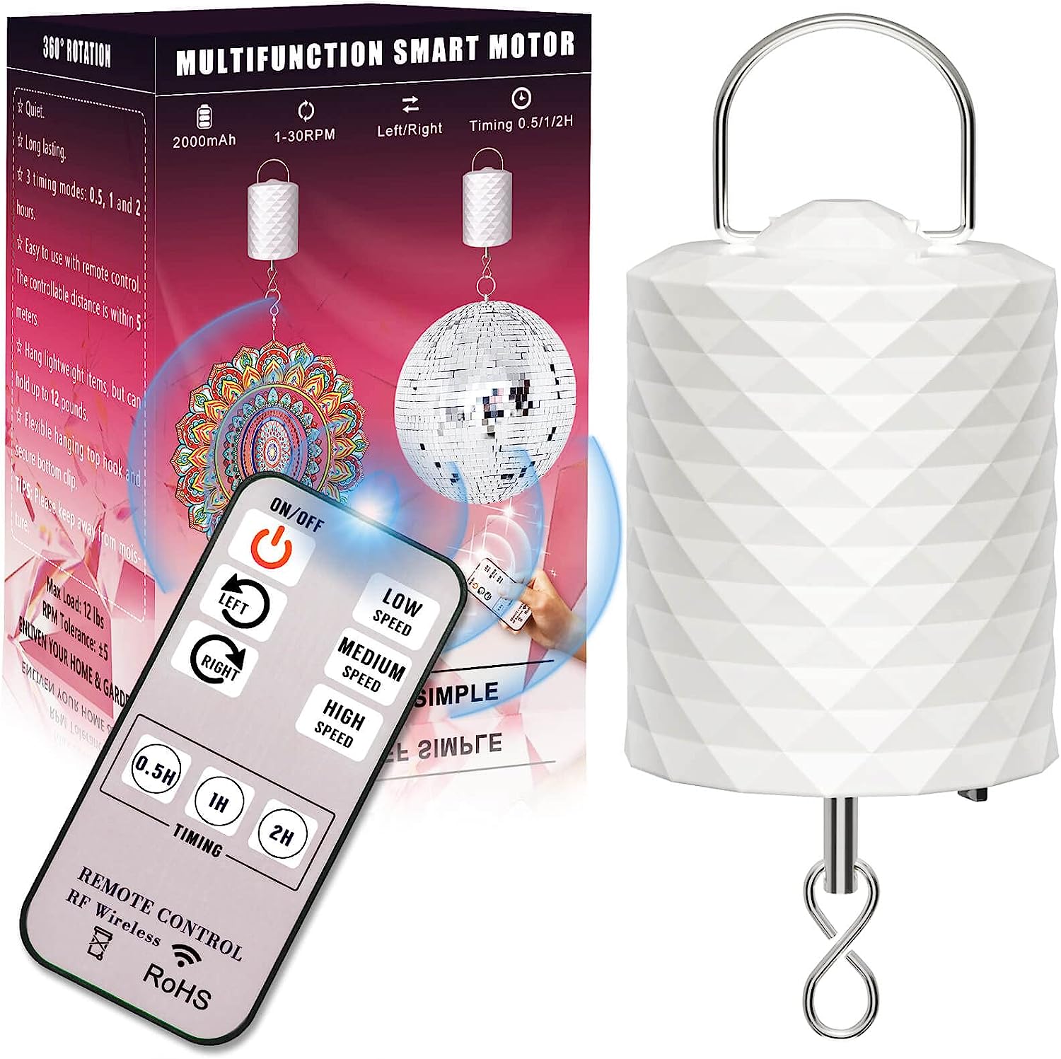 - 🎊 QUIET HANGING DISPLAY SPINNER MOTOR: The white mirror ball motor battery operated has small power consumption and quite with noiseless, is easy to hang up and save space. The rechargeable spinner motor can hold up to 15 pounds. The baby mobile spinner speed depends on battery power & item weight. It can run all day and never get hot. The rotating speed of this small ornament motor can perfectly spin your hanging decor to show the cool reflective visual effect.