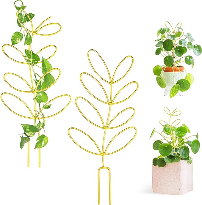 Plant Trellis for Climbing Plants, 2 Pks Garden Trellis 12” Leaf Shape Plant Trellis Metal Wire Stake for Potted Plants, Houseplant, Home Plant, Mini Rose, Plant Lover Gifts (Golden)