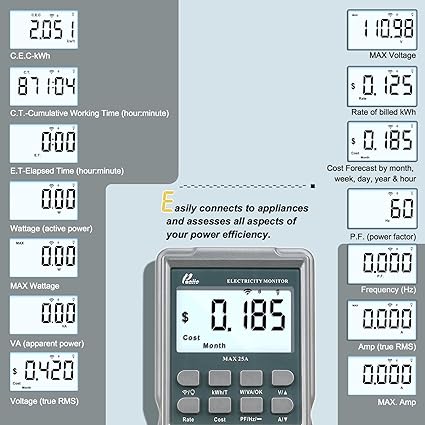 - ELECTRICITY TESTER: Gain comprehensive insights with a wide range of metrics including Watts/VA, kWh, Time, Amp, Start-up Amp, Volt, PF, Hz and Cost etc.