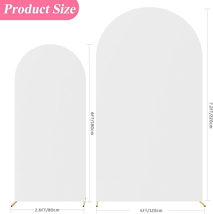 - 【Double-sided Wedding Arch Cover】Material: Spandex. Color: White. Size: 7.2ftx4ft & 6ftx2.6ft(HxW). The double-sided chiara arch stand cover is a stylish and practical decoration that can add elegance and sophistication to any wedding or event.
