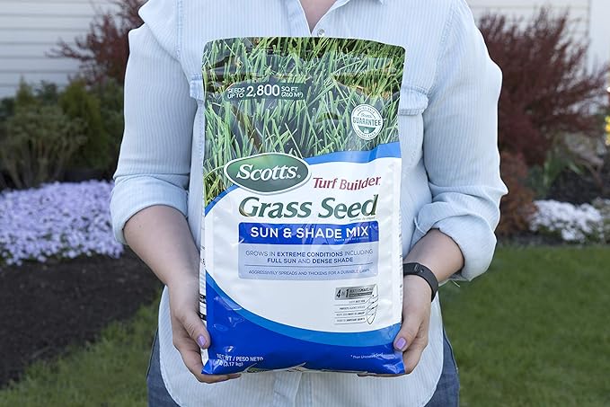 Scotts Turf Builder Grass Seed Sun & Shade Mix is Scotts most versatile mix that stays green even in extreme conditions of dense shade or scorching sun. Scotts wraps each seed in a unique WaterSmart PLUS Coating that absorbs 2x more water than uncoated seed, feeds with essential nutrients, and protects seedlings from disease. Seeds up to 2,800 sq. ft. Designed for full sun and dense shade, fine bladed texture and medium to high drought resistance. Aggressively spreads to repair bare and thin spots. Grow Quicker, Thicker, Greener Grass. Guaranteed.