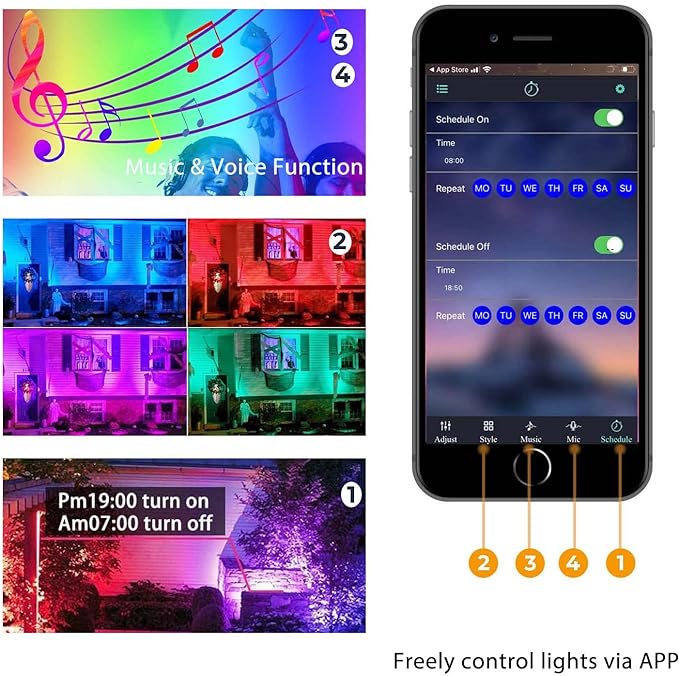 - 2、16 Million Custom Color: The lights have 16 million colors and 20 modes, strobe speed, music rhythm, timing switch, etc. This 36 bright LED bulbs landscape light remote have 6 colors adjustable and 5 modes, 4H 8H 12H Timer. This colorful LED make a beautiful landscape lighting effect.The White color is an RGB combined color, not real White.