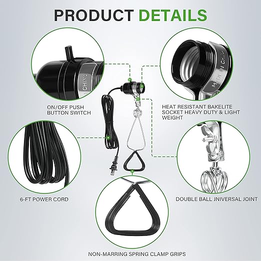 - Advantage: bakelite socket, light weight, durable; Non-marring clamp grips for a secure hold; A convenient on/off button with 6 feet long cord