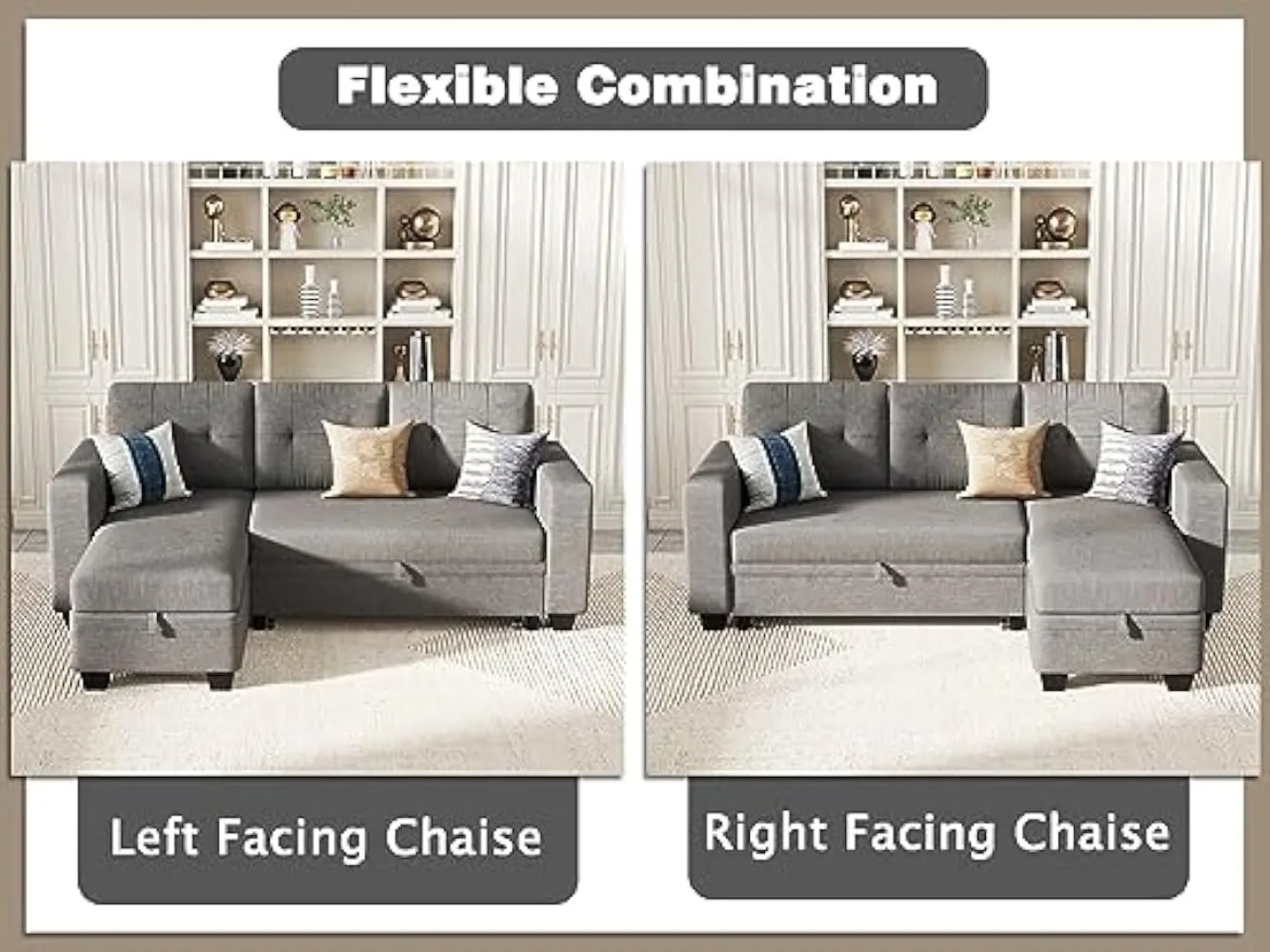 - Hidden Storage Space: This reversible sectional sofa features a chaise lounge which can be used as storage space at the same time. Hidden storage space is measuring 40.9 (L) x 20.1 (W) x 6.3 (H) inches, the stuff which will mess the living room up can be collected well in a clean and neat way with it.