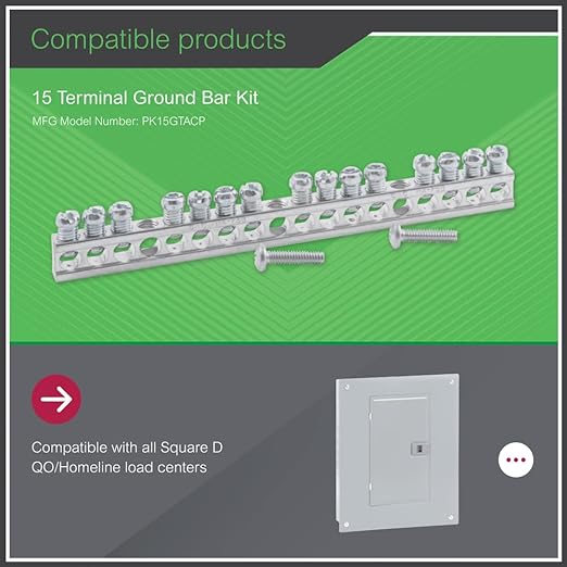 The Square D By Schneider Electric Ground Bar Kit is an important accessory in your home or business electrical load center. The aluminum 15 Terminal Ground Bar Kit is used in Square D load centers, CSED devices and NQOD and NF panel boards. The kit has 15 terminals, each accepting (1) #14 – #4 copper wire or (1) #12 – #4 aluminum wire, or (2) #14 – #12 copper wire or (2) #12 – #10 aluminum wire.