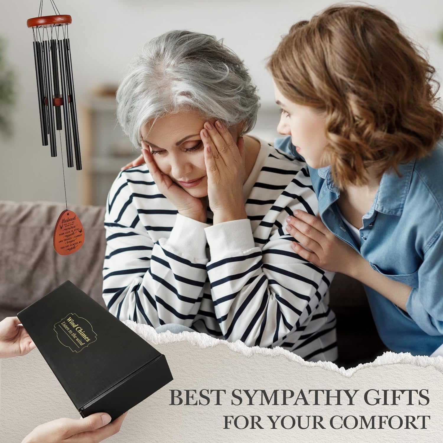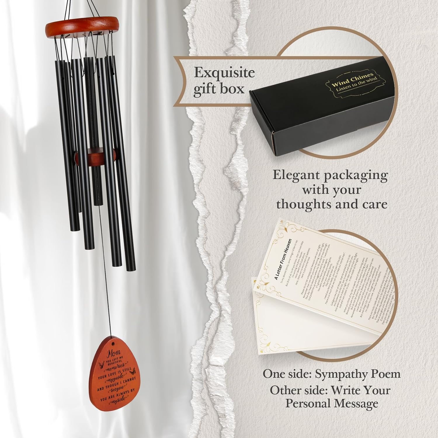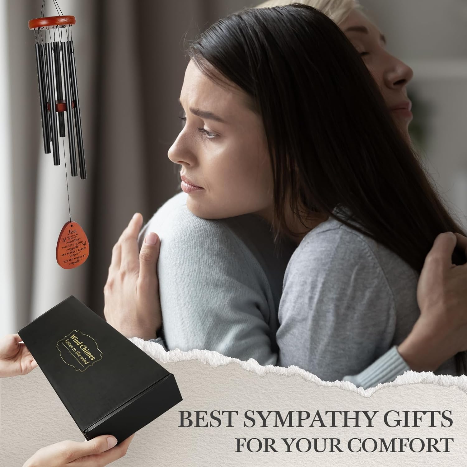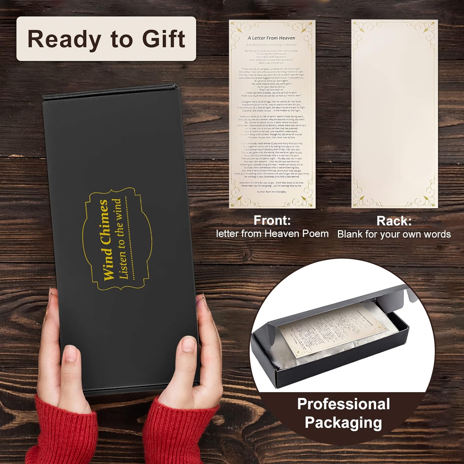 - Campanillas de viento para la pérdida de un ser querido: las campanillas de viento de simpatía vienen empaquetadas de forma segura en una elegante caja negra con papel envuelto y cada uno de los tubos de campanillas de viento protegidos en el interior. Junto con la campanilla de viento conmemorativa, hay una tarjeta de condolencia “Carta del Cielo” con una parte trasera en blanco para escribir tu mensaje de condolencia personal. Regalos ideales y reflexivos para el duelo para simpatía, condolencia y funeral.