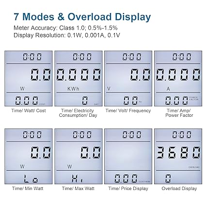 - 【 3680W Overload Indication 】 This power monitor meter can measure 110-130 Vac & 200-240 Vac voltage (Note: Label on watt meter back only shows 110-130 Vac low volt range due to certification requirements); 0-16A AMP; 0-3680W wattage, and indicate overload when load up to 3680W; Class 1.0 accuracy standard with 0.1W, 0.1V, 0.001A and 0.001kWh resolution