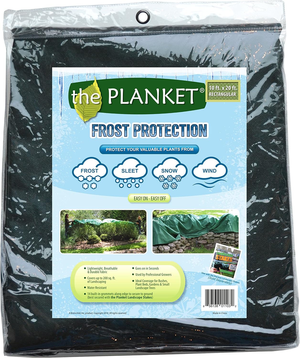 The Planket is a plant blanket that helps protect your valuable plants from frost, sleet, snow, and cold winds. This rectangular shaped plant cover measures 10 feet by 20 feet & covers up to 200 square feet and is made of spun-bonded, nonwoven material. There are 14 built-in grommets along edge to secure the Planket to ground (best secured with the Planket Landscape Stakes). The lightweight, but durable material allows plants to breathe. Goes on in seconds and folds up nicely for easy storage. Available sizes include the 6 ft. Round, 8ft. Round, 10ft. Round, 10 ft. x 12 ft. Rectangular, 10 ft. x 20 ft. Rectangular & 6 ft. x 50 ft. Roll.