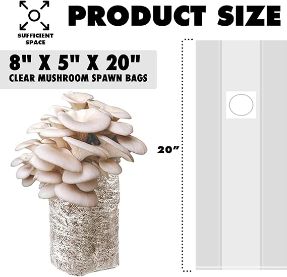 • LARGE 8″ X 5″ X 20″ CLEAR MUSHROOM SPAWN BAGS – Save a considerable amount of space by spawning and growing more mushrooms in one grow bag. At 6 inches long, 5 inches wide, and 20 inches high, these myco bags provide more than enough room for growing, spawning, and fruiting mushrooms. Even at this height, these side-gusseted bags can stand upright and hold the weight of their contents.
