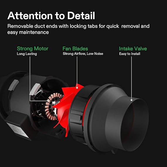 - Powerful Inline Fan: Made of galvanized steel, the 4-inch inline fan runs at a speed of 2300 RPM and produces an air flow of 190 CFM, with a noise level of just 30 dB the maximum
