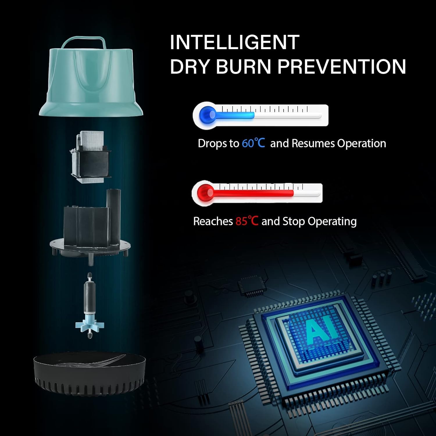 • Anti-Drying Design: When the temperature reaches to 185 ℉(85℃), the built-in thermal protector chip will stop the pump from draining and pumping water; Pure copper wiring delivers more stable power for a longer service life and more energy savings