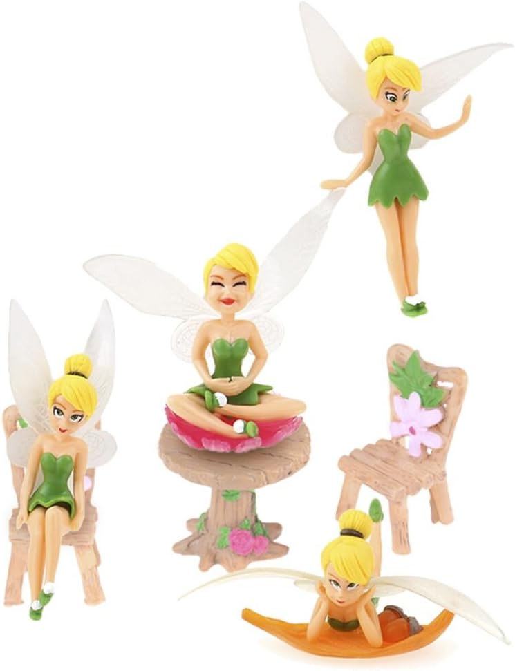 Package includes: 4 x different flower fairy ornaments, 1 x miniature table, 2 x miniature chairs