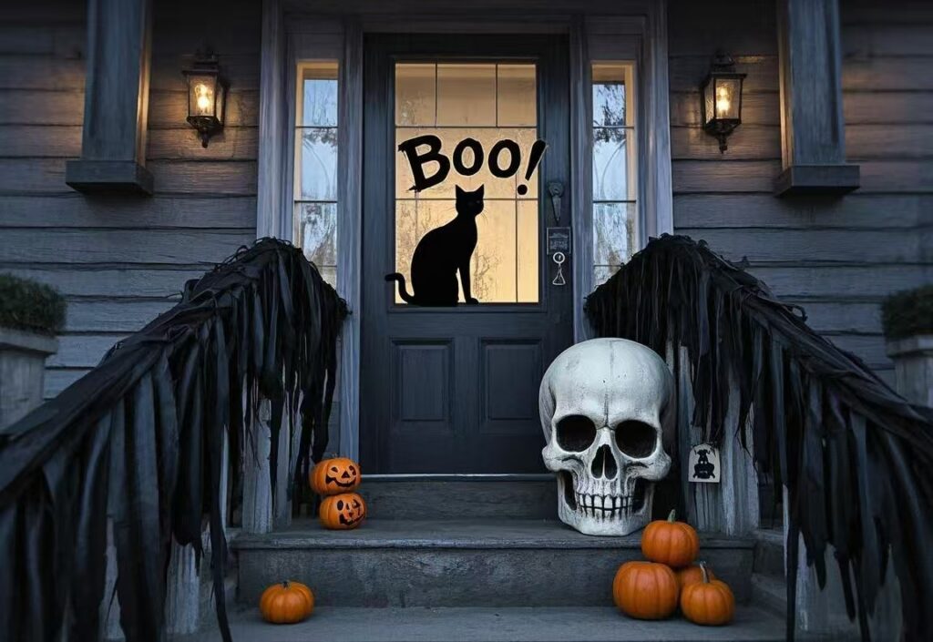 Hang Halloween – themed banners or signs on your porch. You can find ones that say “Trick or Treat,” “Beware,” or have spooky images like bats, skulls, or haunted houses. Make your own signs using cardboard, paint, and markers for a personalized touch. A “Welcome to our Haunted House” sign at the entrance of the porch sets the perfect tone for what’s to come.