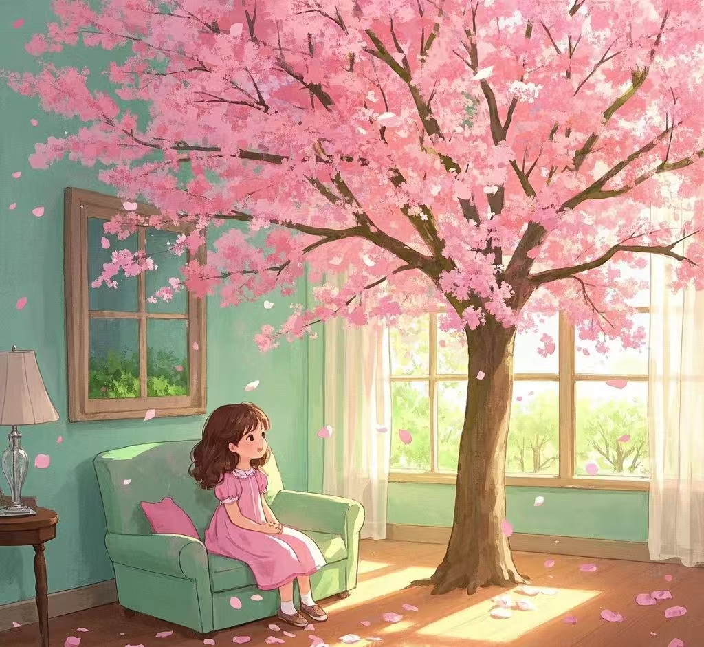 Adding some floating clouds or a gentle blue sky around the tree can further enhance the feeling of being outdoors under the shade of a blooming cherry tree.